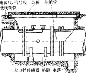 由于大口径管道在多数场合下是埋在地下的,因此大口径传感器在安装前应做好水泥地坑。图6-19所示是在给排水系统中常见的安装形式。水泥地坑应有足够的活动空间,侧壁埋有敷设电缆的钢管,上有盖板防止雨淋,下有泄水管以免坑内积水而使传感器侵水。为了拆装方便,传感器应放在垫脚上,且在下游侧装有活络的伸缩管。图6-20是电磁流量计在地下水泥管污水排放系统中的安装实例。
