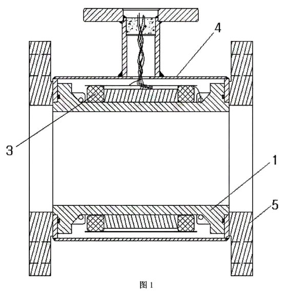 所述导流管1上固定有一全封闭的密封罩4,其两端各设有一电磁配对法兰5,其管壁上设有两个贯通其管壁的测量孔,每个测量孔对应一个测量电极2,每个测量电极2的一端插入其对应测量孔中,每个测量电极2的外周面与对应测量孔的孔壁之间均用绝缘隔套隔离并密封,各测量电极2及各励磁线圈3均罩设在密封罩4内,并各经导线引出密封罩4;其特征在于:所述导流管1是一塑胶绝缘管体。