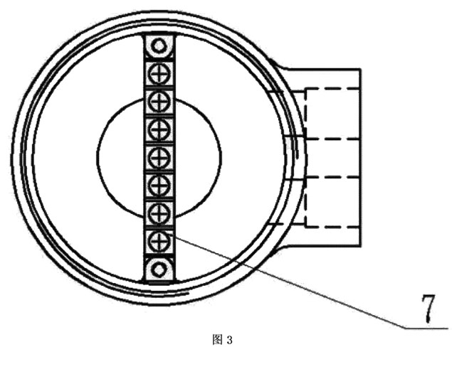 本实施例如图4所示,分体接线盒用4只M6的螺钉8将売体3与固定在流量传感器7上端,壳体3与传感器7之间采用橡胶密封垫9密封。端子排7用两个M4的螺钉固定在売体内,接线端子通过连接电缆5,穿过安装在壳体上的格兰头6连接到变送器。分体盖1通过螺纹拧紧在壳体3的上端,分体盖1与売体3的密封采用0型圏密封。使用时电缆5与管道轴线方向一致,管道为垂直方向时,电缆出线方向朝下,从而不会造成外部的液体流入壳内。
