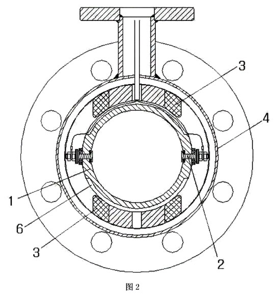 以下结合附图说明对本发明的实施例作进一步详细描述,但本实施例并不用于限制本发明,凡是采用本发明的相似结构及其相似变化,均应列入本发明的保护范围。如图1-图2所示,本发明实施例所提供的一种电磁流量计的无树里测量头,包括导流管1、测量电极2和励磁线圏3,所述测量电极2和励磁线圈3各有两个,沿导流管1的周向轴对称交替固定在导流管管壁上;