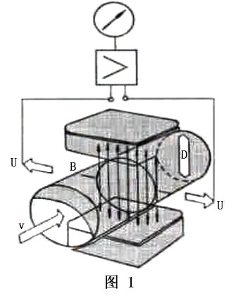 如图1所示,在一内径为D,内部磁场强度为B的非导磁性测量管内,液态的具有导电性被测介质以v的速度流动,则在与流动方向垂直的方向上产生与流量成比例的感应电势U,该电势的大小如下