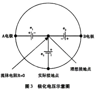 在被测液体与电极和接液部件接触过程中,电解质中的正负离子会分别作定向运动,这会使被测液体在电极和接液部件之间形成电位差,通常将这种现象称为极化现象。如图3所示,理论上来说,两电极A和B对接液部件的电位e1、e2大小相等、方向相反,此时两电极的电位差等于零。但是,若两电极的材质或表面状态存在差异,此时A、B电极之间的电位差就不为零,这就形成了极化电压,极化电压与共模状态的电压e3一起叠加在流量信号中,被输入转换器的差动放大器。当极化电压过大,则会对差动放大器的输入端造成较大影响,导致信号无法放大或流量信号的输出波动过大,从而降低了电磁流量计的测量精度。