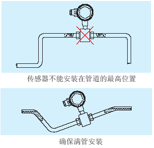 确保流量传感器在测量时,管道中充满被测流体,不能出现非满管状态。如管道存在非满管或是出口有放空状态,传感器应安装在一根虹吸管上。