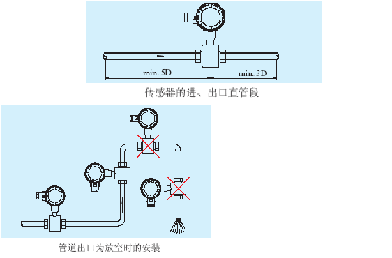 当出口为放空状态时,传感器不应安装在管道放空之处,应安装在较低处。传感器安装在管道下方处时,应保证传感器内被液体充满,不能出现空管状态。