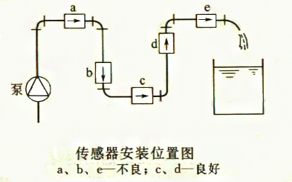 传感器安装方向水平、垂直或倾斜均可,不受限制。但测量固液两相流体*好垂直安装,自下而上流动。这样能避免水平安装时衬里下半部局部磨损严重,低流速时固相沉淀等缺点。 水平安装时要使电极轴线平行于地平线,不要处于垂直于地平线,因为处于地步的电极易被沉积物覆盖,顶部电极易被液体中偶存气泡擦过遮住电极表面,使输出信号波动。图所示管系中c、d为适宜位置a、b 、e为不宜位置,b处可能液体不充满a、e处易积聚气体,且e处传感器后管段短也有可能不充满,排放口*好如f形状所示。对于固液两相流c处亦是不宜位置。