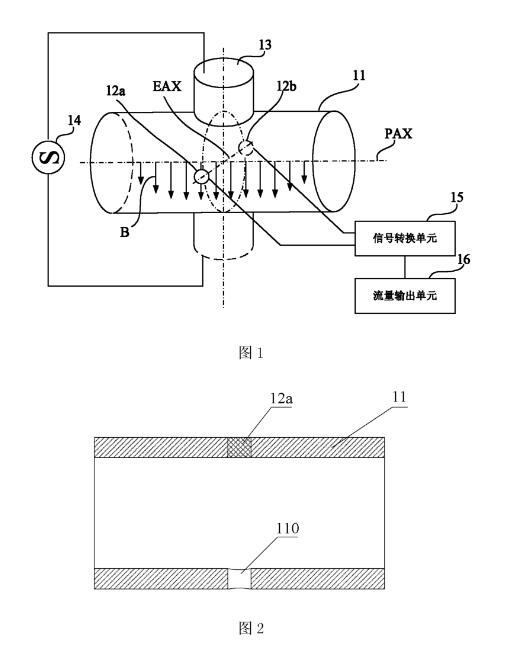 图1显示了现有技术中的一种电磁流量计的结构。如图1所示,所述电磁流量计包括:流动有被測流体的测量管11,和与被测流体相接触且对向配置在测量管11上的电极12a、12b,向被测流体施加磁场的励磁线圈13,向励磁线圈13供给励磁电流、使其产生磁场的电源单元14。另外,所述电磁流量计还包括:与电极12a、12b连接用于检测电极12a、l2b之间的感应电动势的信号转换单元15,从由信号转换单元15检测出的电极间电动势计算出被测流体的流量的流量输出单元16应用所述电磁流量计,当流体在测量管11中穿过由励磁线圈13产生的磁场流动时,根据法拉第定律,就会在电极12a、12b上产生感应电动势,流体的平均流速与电极处感应出的电压之间具有线性关系,这一关系可以用下述公式表示:E=K*B*举V,其中E为所产生的感应电压,K为比例常数,B为磁场强度,D为导管直径,而V为传导型流体的平均流速这样,利用信号转换单元15和流量输出单元16,即可测得与所述感应电动势对应的流体的流速,进而获得流体的流量陶瓷管电磁流量计传感器有很多优点,但电极密封是一个很大难题。图2为图1中沿着与励磁线圈13产生的磁场相垂直的平面用以显示电极布置的剖示图。如图2,测量管11设有电极插孔110,所述电极插孔110为圆柱形或圆锥形,其厚度大致与测量管11的壁厚相当,电极(在这里仅标示出电极12a)内嵌于测量管11的电极插孔110中。然而,图2所示中的电极,只有少数厂家具备特殊的烧结技术,在高温高压环境下制作出电极以确保电极不渗漏,实现难度极大。而采用0型圈等机械装配密封,由于陶瓷材料表面一定厚度会变湖,使用时间一长,绝缘性就会下降,影响测量精度