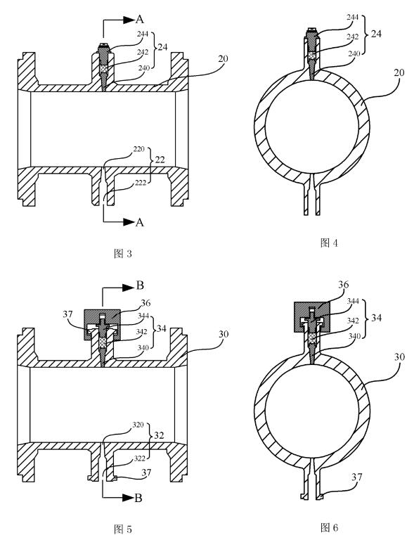 特别地,在本实用新型的电磁流量计传感器中,对向配置在陶瓷测量管20相对两端的一对电极插孔22外凸于所述陶瓷测量管呈凸台状。相对于电极插孔的深度与陶瓷测量管的管壁厚度相当(相近或相等)的现有技术,本实施例中的电极插孔22的深度要远大于(2倍以上)陶瓷測量管20的管壁厚度。具体地,电极插孔22为内缩外扩的沉孔结构,包括指向陶瓷测量管20内壁面的**插孔区段220以及与**插孔区段220相连、指向陶瓷测量管20外壁面的第二插孔区段222。其中,**插孔区段220中远离第二插孔区段222的那一个端面是与陶瓷测量管20内壁面相齐平。**插孔区段220呈圆柱状或圆锥状(呈内窄外宽);第二插孔区段222呈圆柱形或圆锥形(呈内窄外宽);第二插孔区段222和第插孔区段220的连接面呈平面或圆锥面,较佳地,呈圆锥面。针对电极插孔22的制作,在一个实施例中,可以是在陶瓷测量管20的烧结工艺前预留有与电极插孔22对应的结构从而在烧结工艺后形成,例如采用了与待形成的电极插孔对应的模具并在烧结工艺后去除所述模具从而形成电极插孔22:或者,在另一实施例