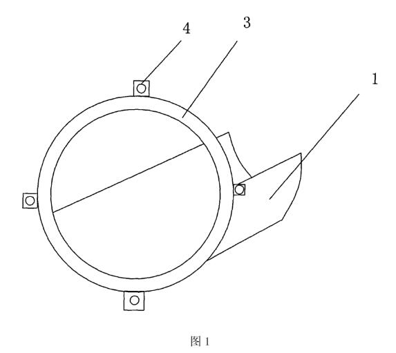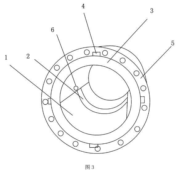 下面结合附图和实施例对本实用新型做进一步描述。虽然本实用新型将结合较佳实施例进行描述,但应知道,并不表示本实用新型限制在所述实施例中。相反,本实用新型将涵盖可包含在有附后权利要求书限定的本实用新型的范围内的替换物、改进型和等同物参见图1至图4所示,本电磁流量计耐磨装置由相向的两块弯曲带法兰3的耐磨板1组成,耐磨板1为不锈钢板,厚3mm,其外径弯曲度和需配套的流量计管体5内径相符,和衬胶紧贴,耐磨板1弯曲后的弧度高须低于感应电极6有5mm-10mm。,相连的法兰3材质也为不锈钢,厚度无要求,直径和需配套的流量计管体5一致,法兰3用螺钉孔4固定在电磁流量计管体5的法兰上。弯曲的耐磨板1和法兰3用氩弧焊焊接在一起,在其中一块弯曲的耐磨板1上再加焊一块弯曲的搭板2,使污泥浆流经耐磨板1时保证不发生停留和沉淀。本实用新型的耐磨板1不做成单一整体,做成左右两半,主要是考虑这样做工艺制作简单,容易和流量计衬胶紧贴不产生空隙,做成两半拆装也方便,由于不锈钢不吸收磁场磁力线,法兰3和流量计管体5法兰连接相当于接地,因此本实用新型的电磁流量计耐磨装置既没有减弱感应电动势的输出,也没有形成新的干扰源,所以对电磁流量计的工作没有影响该电磁流量计耐蘑装置结构简单,成本低廉,更换或增添方便,理论上材质只要不是铁都可以,但以不锈钢*为合算。该电磁流量计耐磨装置也可用于采矿作业和其他一切有液固两相体的管道