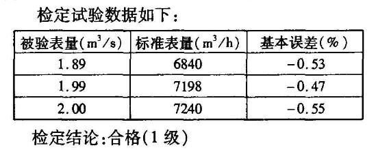 2.实施现以其中1台开封仪表厂生产的口径1600mm的0.5级电磁流量计为例,分析超声波流量计的检定方法及其优缺点。此台1600mm口径的流量计安装于江心洲污水处理厂的进水管线上,由于行业特点,无法做到断流停役,即使断流停役,由于安装于室内,空间狭小,电磁流量计无法拆卸搬移,因此不能采用传统的送回校验的方法,只能采用在线检测的方法进行检定。二零零四年元月,南京市质量技术监督局流量钢卷尺计量检定站到现场进行在线检测标准表为精度为0.5级的多普勒法超声波流量计。