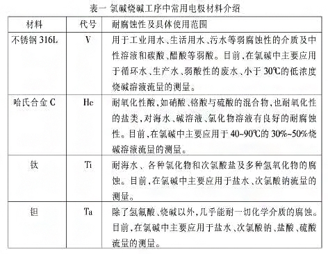 电磁流量计的测量电极是与工艺介质直接接触的**金属材料,其作用是与导线连接将测量管中产生的微弱感应电动势传输到转换器中的检测单元。由于电磁流量计的电极部分处于工作磁场中,为防止磁力线在电极上集中,电极材料必须使用非导磁的金属材料;并根据工况介质对金属材料的腐蚀速率(mm)a,即毎年被腐蚀掉的金属厚度)来确定不同的工况介质选择不同的金属材料。下面通过图表一的方式介绍在氯碱烧碱工序中常用的几种电极材料及其使用范围。
