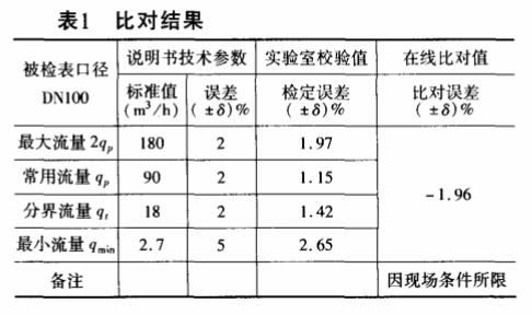 在使用现场,该流量计在线测量供水流量。检测设备采用日本富士便携式超声波流量计作为比对表(该比对表通过国家大流量检测站校准,并取得了检定证书),准确度为.5%,对在线电磁流量计进行比对,比