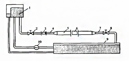 1一溢流水塔;2一截止阀:3一标准流量计( E-mag dN1000);4一DNI000管路;5大管径试验管路;6—被检流量计;7一DN1000管路;8一调节阈;9—蓄水池;10一泵