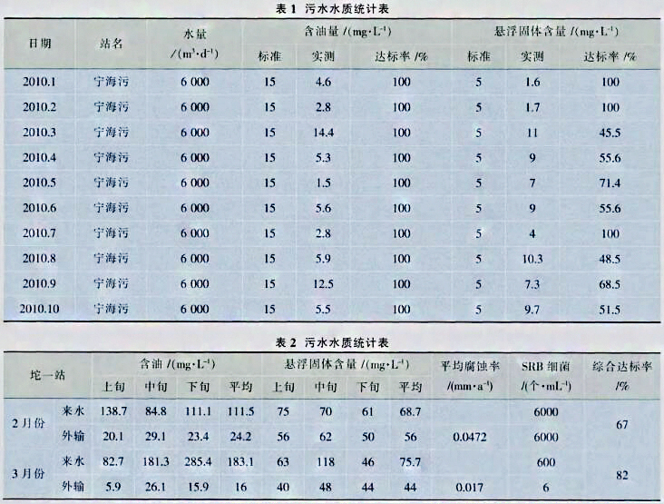 20l1年2月坨一站来水含油平均183.lmg/L外输含油平均16mg/L,悬浮固体平均8.3mg/L,平均腐蚀率0.017mm/a,SRB细菌平均6个/ml。只有悬浮固体含量超标。