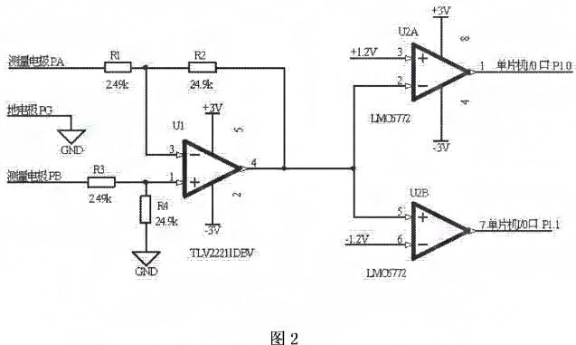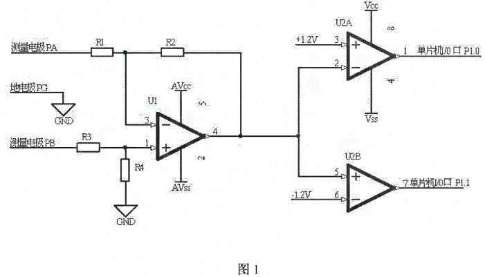 如图2所示,测量电极PA与电阻R1的一端连接,电阻R1的另一端与电阻R2的端、运算放大器u的反相输入端3脚连接,电阻R2的另一端与运算放大器U的输出端4脚、双路比较器通道一U2A的反相输入端2脚、双路比较器通道二U2B的同相输入端5脚连接,测量电极PB与电阻R3的一端连接,电阻R3的另一端与电阻R4的一端、运算放大器U的同相输入端1脚连接,电阻R4的另一端与地连接,地电极PG与地连接,运算放大器U1的电源供电端5脚与正电源+3V连接,运算放大器U1的接地端2脚与负电源-3V连接,双路比较器通道一U2A的同相输入端3脚与+1.2V连接,双路比较器U2A的电源供电端8脚与正电源+3Ⅴ连接,双路比较器υ2A的接地端4脚与负电源-3V连接,双路比较器通道U2A的输出端1脚与单片机的I/0口P1.0连接,双路比较器通道二U2B的反相输入端6脚与-1.ΣV连接,双路比较器通道二U2B的输出端7脚与单片机的I/0口P1.1连接工作原理:电阻R1与电阻R3相等,电阻R2与电阻R4相等,且电阻R1为10倍电阻R2;电阻R1、电阻R2、电阻R3、电阻R4、运算放大器U1组成了一个差分放大电路,放大倍数为10。当测量电极PA电位等于测量电极PB电位时,双路比较器通道一U2A的反相输入端2脚和双路比较器通道二U2B的同相输入端5脚的电位为零,双路比较器通道一U2A的输出端输岀高电平,双路比较器通道二U2B的输岀端输岀高电平。当测量电极PA电位高于测量电极PB电位120m时,双路比较器通道一U2A的反相输入端2脚和双路比较器通道U2B的同向输入端5脚的电位大于+1.2V,双路比较器通道一U2A的输出端输出低电平,双路比较器通道二U2B的输出端输出高电平。反之,当测量电极PA电位低于测量电极PB电位12σmV,双路比较器通道一U2A的反相输入端2脚和双路比较器通道二U2B的同相输入端5脚的电位小于-1.2V,双路比较器通道一U2A的输岀端输岀高电平,双路比较器通道二U郾B的输出端输岀低电平。双路比较器通道一U2A的输岀端和双路比较器通道二U2B的输出端分别连接单片机的1/0口P1.0和P1.1,通过I/0口P1.0和P1.1的高低电平的检测实现电磁流量计测量电极两端是否存在极化电压和极化电压极性的检测。