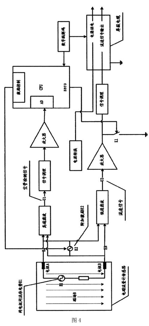 见图1示意图中,电磁流量计传感器在交流励磁下,产生交变磁场,导电流体在交变磁场中切割磁力线产生感应电势E1,通过屏蔽电缆输出至远端信号转换器的主控制电路板,在主控制电路板上输出流速信号并显示见图3、图4示意图中,由CPU控制口产生周期为l6us的高频激励,经模拟转换为高频正弦激励E2,该正弦激励直接施加在,电磁流量计传感器的其中一个电极与地或者是两个电极之间,(图3是一个电极与地之间施加空管检测信号的电磁流量计的电路结构图,图4是两个电极之间施加空管检测信号的电磁流量计的电路结构图);由此产生被测流体内阻Rl的测量信号U1,该测量信号U1与流体内阻R1成线性关系U1=K*R1(K为已知系数)。不可避免的是流体内阻测量信号与流体流速测量信号同时存在,二者混在一起,再经过高通滤波电路将空管检测信号提取岀来,此时对流速信号衰减在60dB以上,经CPU实时采样并经过数字滤波后,与设定的阈值(可调参数)相比较,若判断为空管,则CPU发出zero信号,立刻闭合开关K1关闭流速测量信号,使信号转换器显示为零,否则断开开关KI正常输出流速信号。而电极上流速测量信号经过低通滤波电路,此时对空管检测信号衰减60B以上,再经过信号调理电路后输出流速信号,实现与空管检测信号相互分离,从而保证流速测量的准确度。