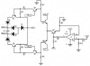 图2为励磁方波产生电路。Ctrl_A、Ctrl_B为相差半周期的方波控制信号,当Ctrl_A为高电平时,三基管Q3工作在放大区,Ctrl_B端信号为低电平,三基管Q4、Q6截止,Q1用作开关管,工作在饱和区,loop_A端输出电压为高电平;Q2工作在截止区,loop_B端电压低,驱动线圈工作;在Ctrl_A端信号的负半周期,分析情况同上,这样,就得到了低频矩形方波。U1A和Q7及电阻构成了恒流源,+VCC为Q7提供基基偏置电压,R9上流过的电流大小是恒定的。这样,Ctrl_A、Ctrl_B端方波相差半周期使得上下两部分的对称电路交替导通,并且产生稳定的励磁电流,驱动线圈工作,达到恒流励磁的目的。DC1提供高电压,反向串联稳压管Z1,输出稳定电压,保证磁基输出方波励磁信号时低电压不至过低。