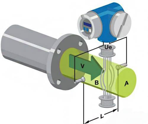 其中,E 为感生电势,k 为常数,B 为磁通密度,D 为测量管的内径,v 为测量管内的流体在电极截面轴向上的平均速度。