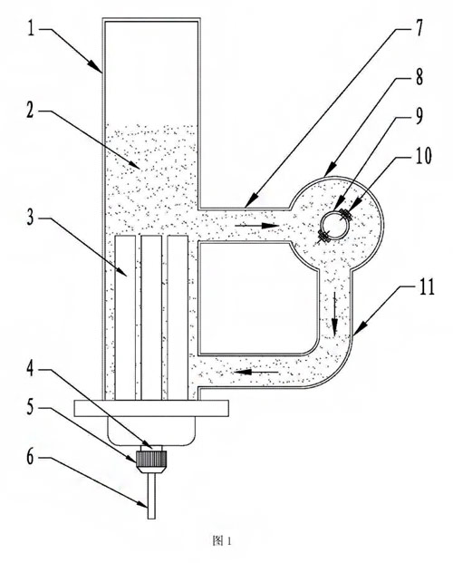 图1为本发明电磁流量计的脱蜡装置结构示意图;图中序号说明:1箱体、2导热介质、3PTC陶瓷加热器、4防爆接线座、5锁紧帽、6电缆、7*介质通道、8吸热器、9测量导管、10电极、11第二介质通道。