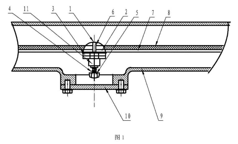 图1所示,可拆卸电极的电磁流量计由外壳9及安装于外壳内的测量管7、及电极组件组成,在测量管内侧安装有测量管衬里8,以隔绝测量介质和测量管的接触。在外壳9上设有凸台,所述凸台上开有中心孔,并通过紧固螺栓固定有压盖10。电极组件由电极轴以及安装于电极轴上的电极头1、电极座6和绝缘电极座套2组成,在所述电极轴的外端部设置有旋钮5,所述电极轴上螺接有压紧螺母3和绝缘座套11,在绝缘座套11与所述旋钮之间的电极轴上套接有弹簧4,以增加电极头1的稳固性。本实用新型不仅方便拆卸,而且正常使用时,电极头也能很牢固地定位,可有效满足测量需求。