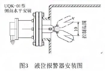 UQK-01-dICT4型液位报警器为水平方向安装,便于报警装置的调试和维护。安装时出线螺孔须向下,外壳采用标准凸面安装法兰,如图3。