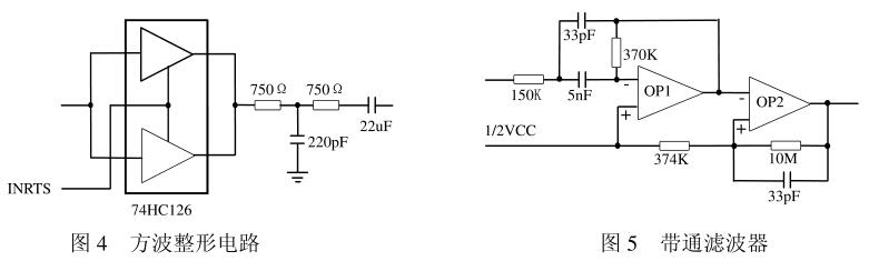 HART MODEM采用Smar公司的HT2012,它是符合Bell202通讯标准的半双工调制解调器,实现HART协议规定的数字通讯的编码和译码,采用16脚DIP和28脚PLCC封装附属电路主要实现信号的滤波整形,由带通滤波器和方波整形电路组成(见图4和图5)。